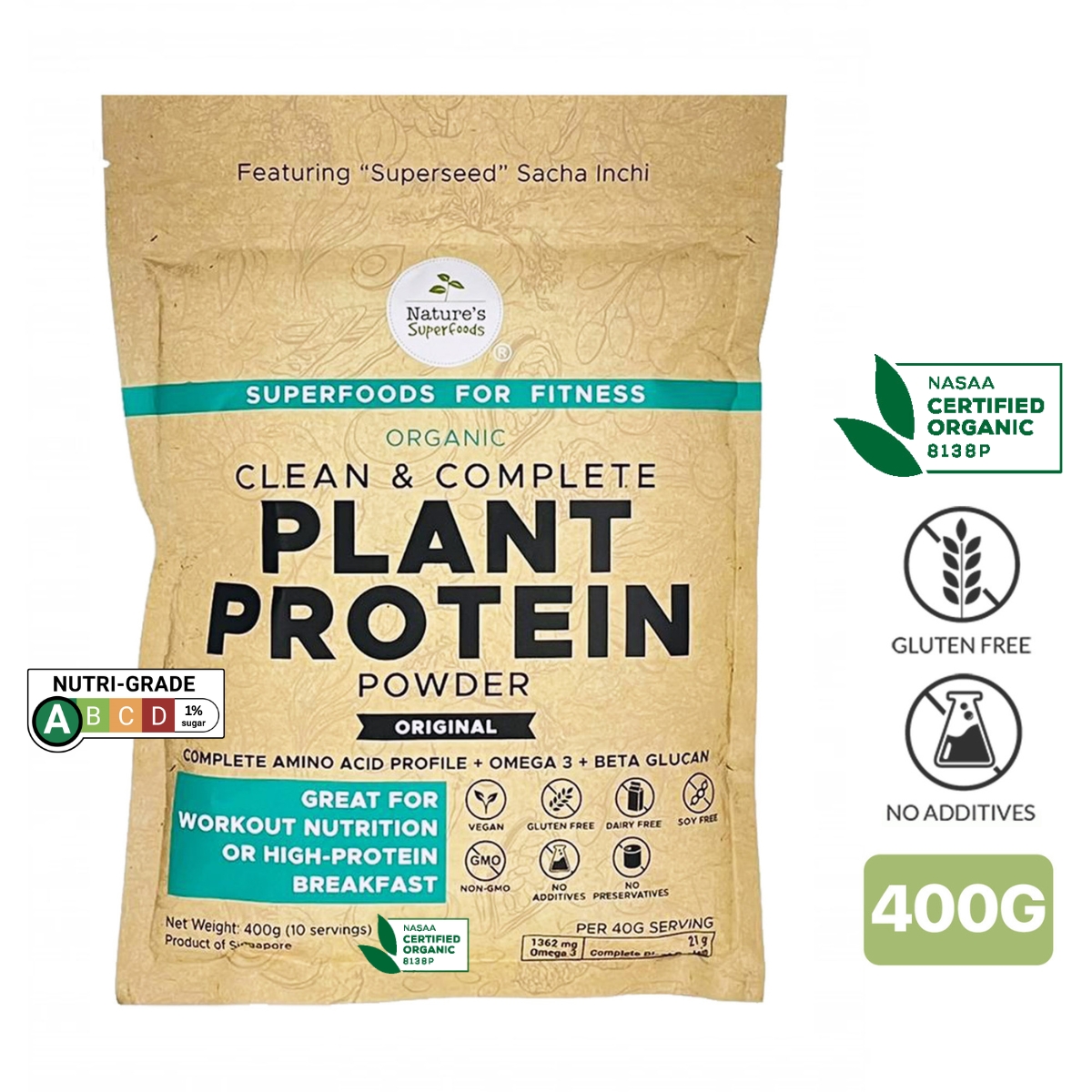 Nature's Superfoods' Clean & Complete Plant-Based Protein Series is thoughtfully formulated by nutritionists to provide high-quality plant-based protein with a complete amino acid profile including important essential amino acids as well as anti-inflammatory Omega-3 fatty acids. As a clean-label protein powder, this series is 100% organic plant-based protein that is free from gluten, artificial sweeteners/flavorings , allergens, GMOs, additives, preservatives or any nasties. No dairy, soy, nuts or refined sugars are added.